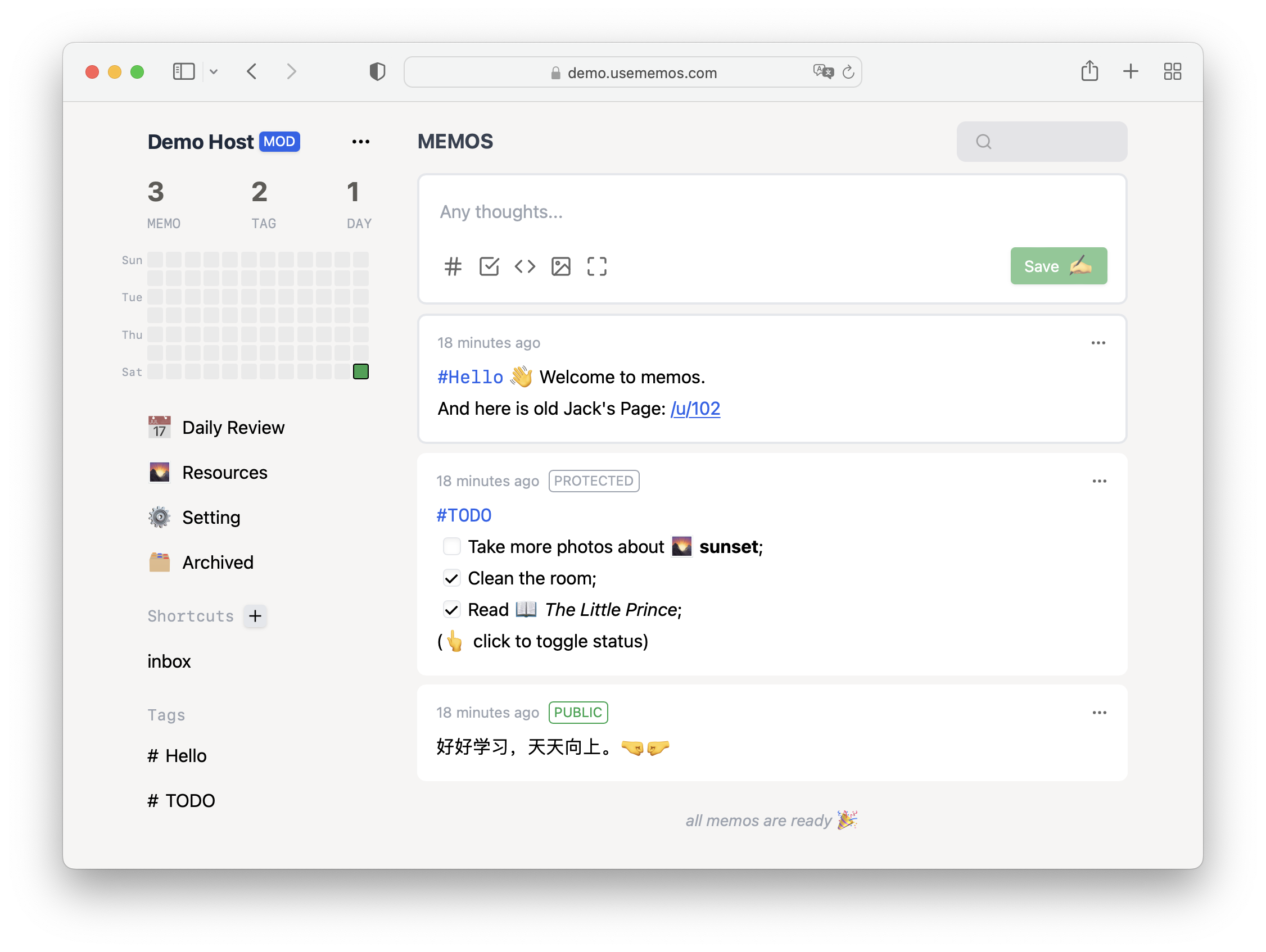 嘿~他来了。 又发现一个好玩的应用。 Memos
